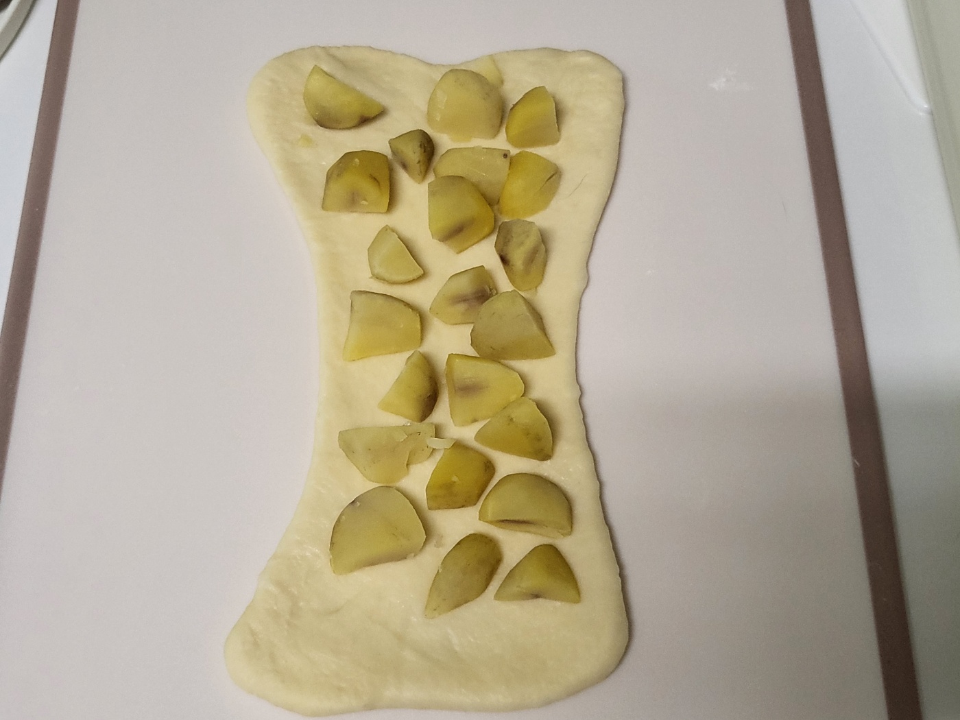 반죽을 핀 상태에서 밤조림을 넣어주세요~