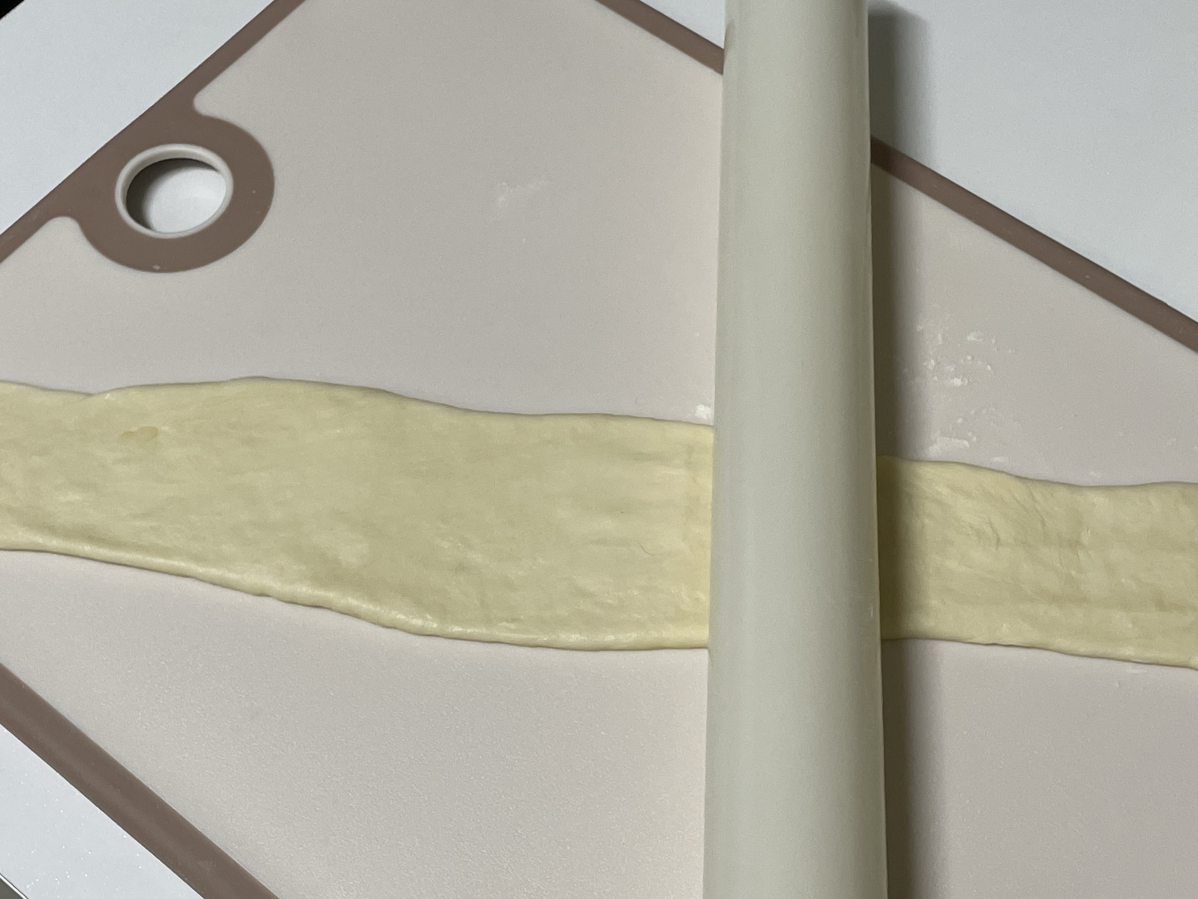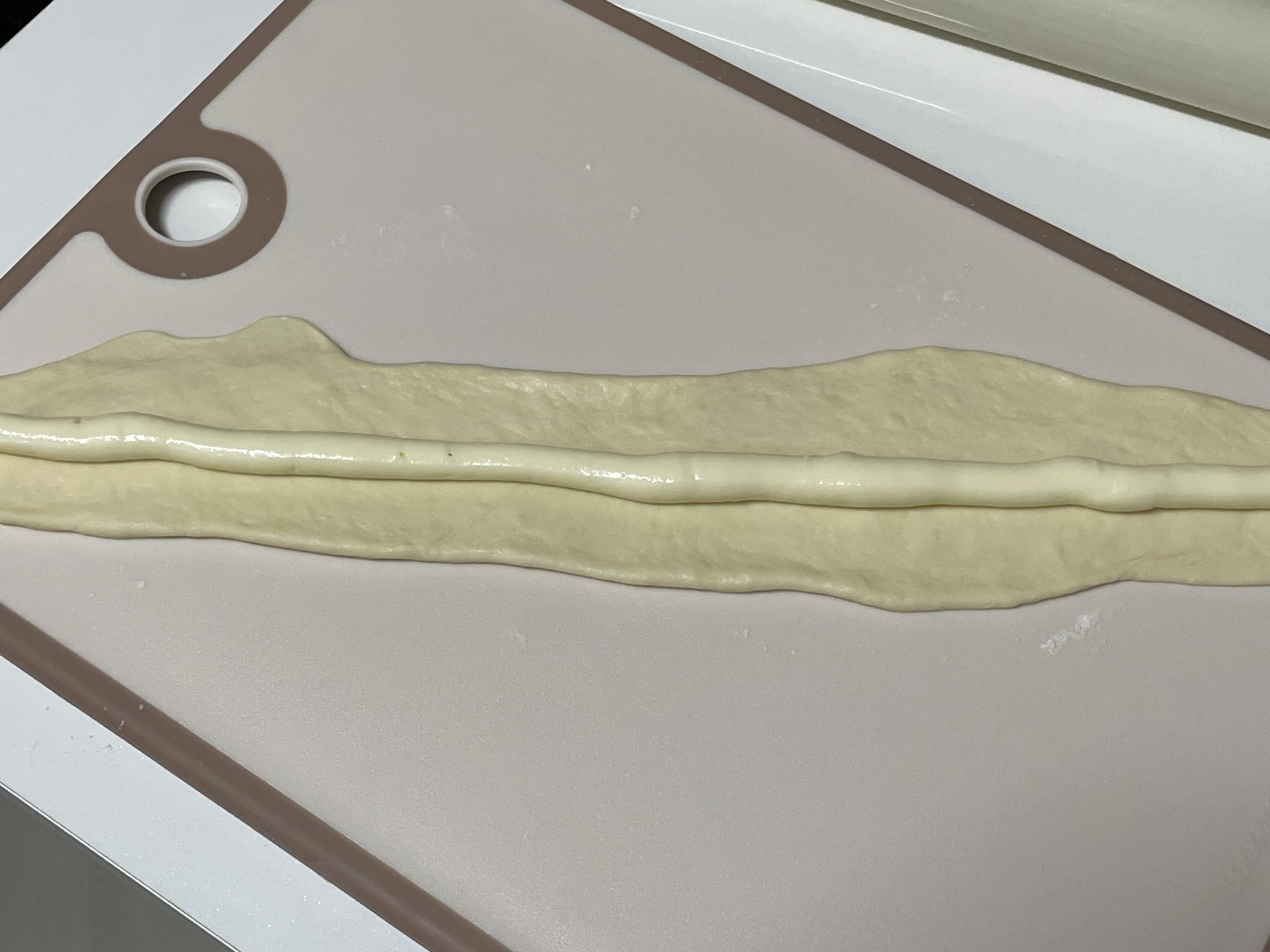 반죽을 길게 밀어 주고 가운데 만들었던 필링 을 일자로 쭈욱~~~짜주세요~
