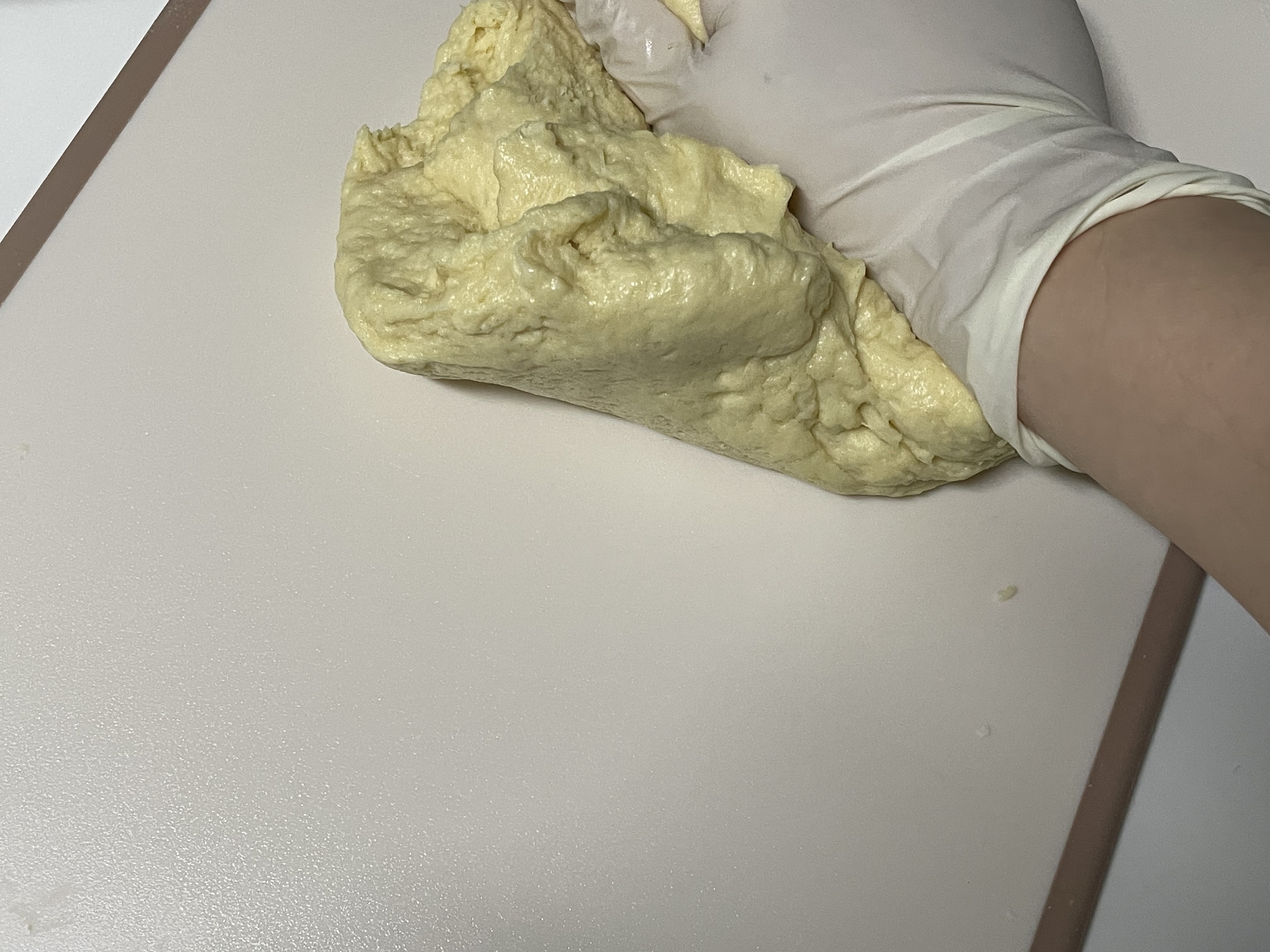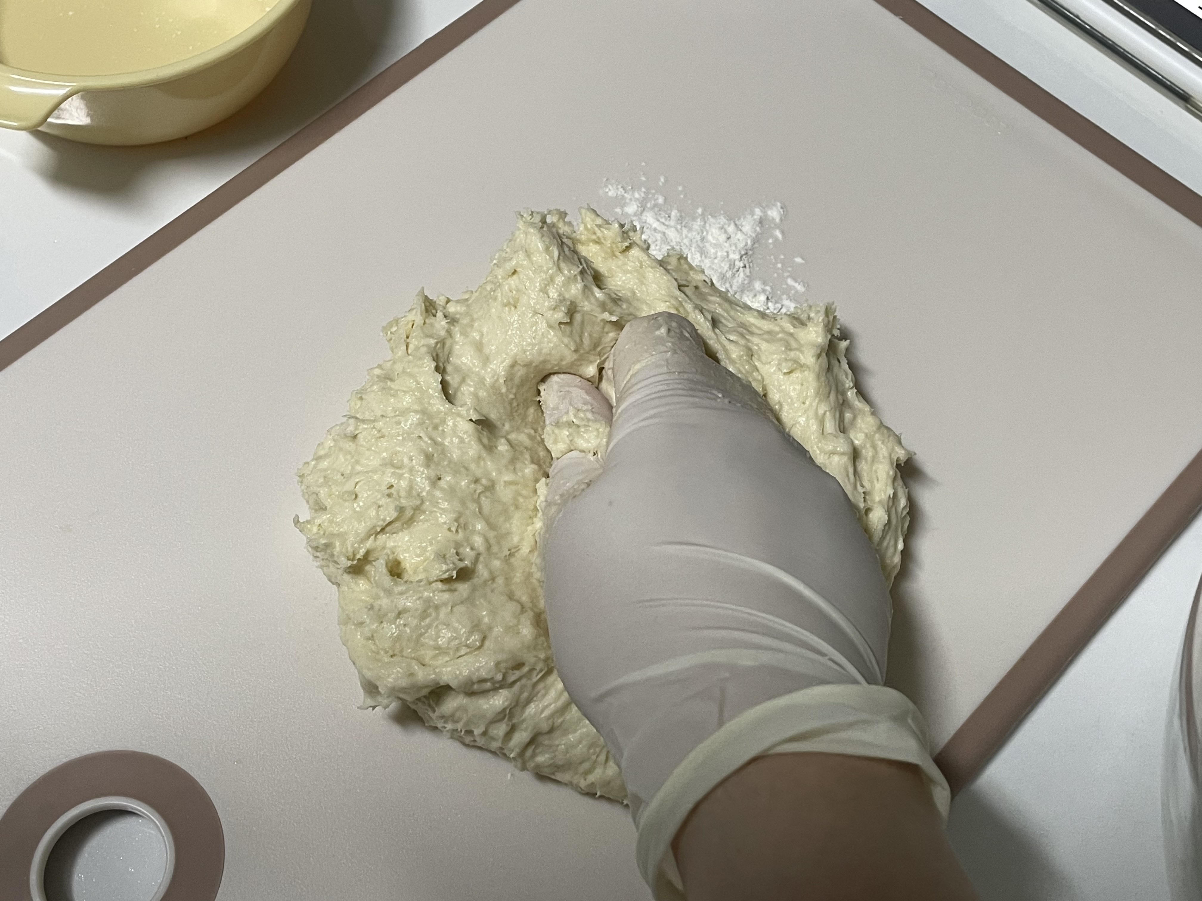 버터가 섞였다면 볼에서 꺼내서 빨래하듯 반죽을 해줍니다